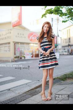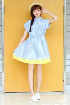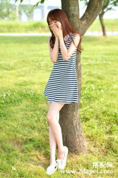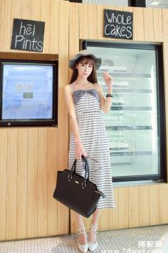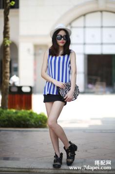 夏天+性感+优雅 夏季出游搭~清爽蓝白条纹海军风无袖连衣裙,搭配花边装饰编织帽子和蝴蝶结凉鞋,清新少女~。夏天+韩范+条纹搭 淑女清爽气息