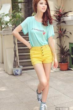 夏天+苗条 展现曲线身材搭清爽淡淡渐变色的短袖T恤,舒适宽松的版型,非常清凉洋气,搭配毛边牛仔短裤,充满青春活力,夏天+日系+清新 穿出青春甜美范