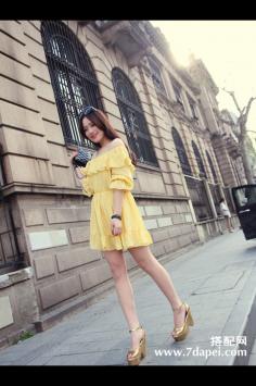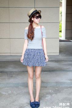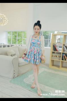 夏天+清新+甜美搭 要美美哒~清新蓝色调的连衣裙,浪漫的花朵印花,小性感一字领露肩样式,配上层叠荷叶边,非常甜美浪漫的连衣裙,很迷人哦。夏天+韩范+矮个子 清新甜美显高