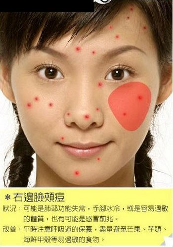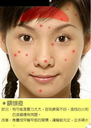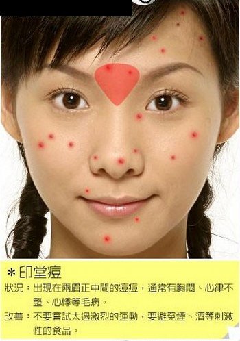 状况:出现在两眉正中间的痘痘,通常有胸闷、心律不整、心悸等毛病。
