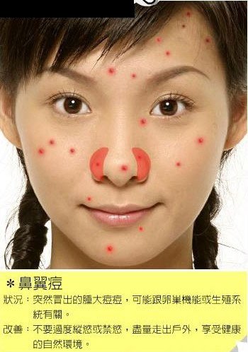 状况:K近鼻子和眼头区域的痘痘,通常是肝机能不好所引起。