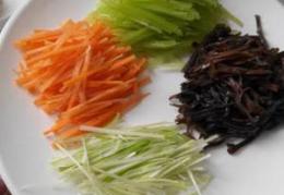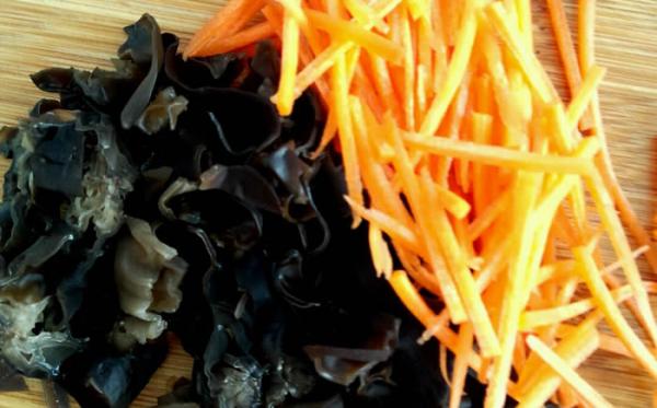 2然后将提前泡好的黑木耳切丝,青红椒,笋都切丝备用