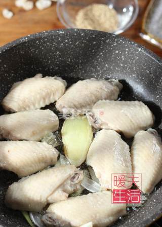 4放进鸡翅,不要翻炒,平铺在锅中,两面都煎一下