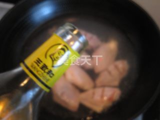 4焯鸡翅2分钟(锅中放入适量水烧沸,放入鸡翅,倒入适量料酒去腥味)。