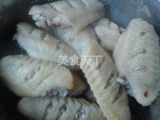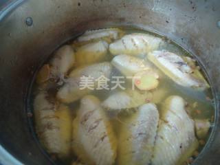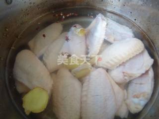 3把鸡翅倒进锅里,锅里加上适量的水,放上些姜片和花椒用水焯一下