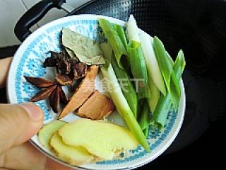 4炒锅倒油倒入葱姜,大料,香叶,桂皮炒香。