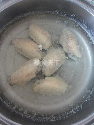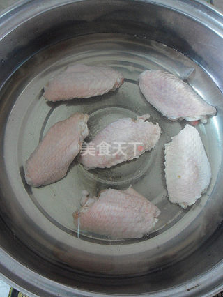 2锅内倒凉水,把鸡翅放入,倒入1茶勺料酒,盖上锅盖煮