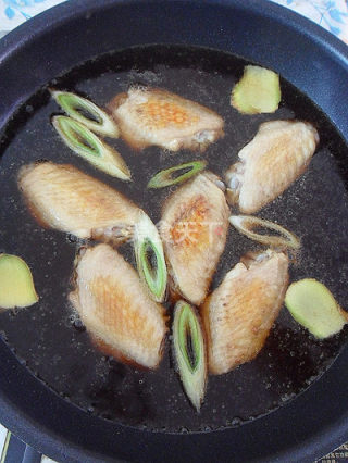 6倒入1厅的可乐没过鸡翅,加入姜片和葱白,倒入半小勺老抽,和半小勺生抽。