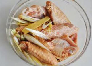 3扎了孔的鸡翅用酱油,葱姜片,盐,料酒,和适量柠檬汁腌30分钟以上。