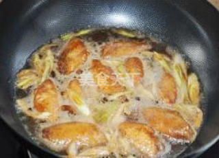5炸好的鸡翅和之前腌鸡翅的料再加半瓶可乐一起放入炒锅中大火烧开。