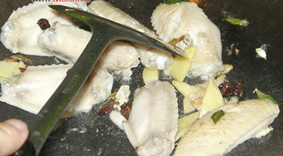 2锅中底油,放入葱段姜片,八角,大料爆香一下,然后倒入鸡翅,煸一分钟这样。