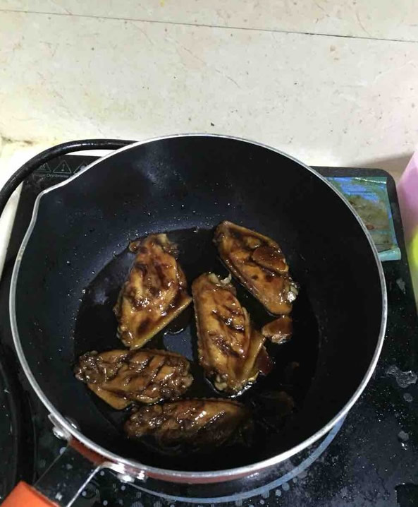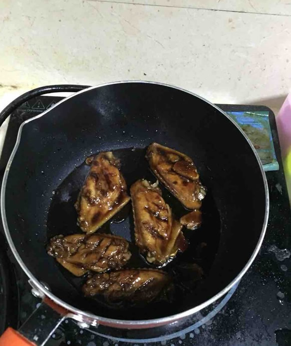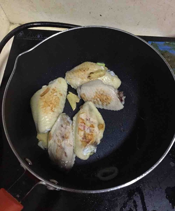 2 在锅中放入少许油,葱姜爆锅,待烧至四五分熟后放入鸡翅,煎至两面焦黄。要一直翻动鸡翅不要让鸡翅粘锅.