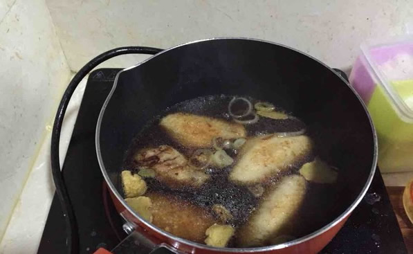 4小火慢慢熬至汤汁渐渐浓稠,期间可尝一下汤汁根据个人口味可放入适当时盐,在收汤的时候为了色泽更加有光泽可加入少量的冰糖.