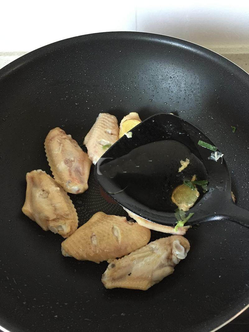 2起油锅,放入姜片和葱段炒香后,倒入鸡翅翻炒。