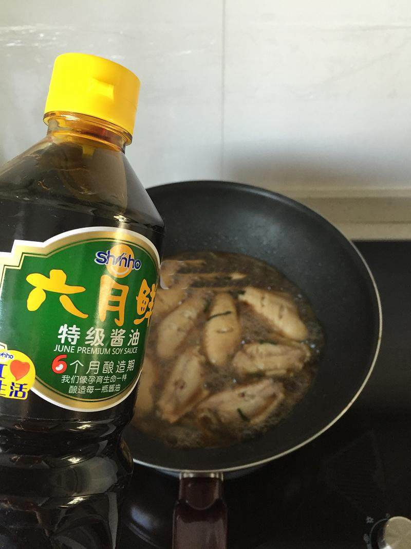5加入一锅铲六月鲜生抽,半锅铲老抽。盖上锅盖,转小火闷。
