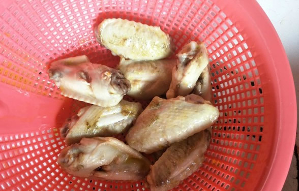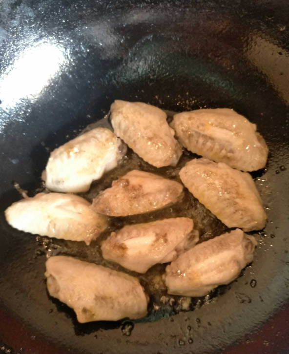 3 倒掉水,锅里放少许油,放入鸡翅,煎至两面金黄时捞出,沥油。