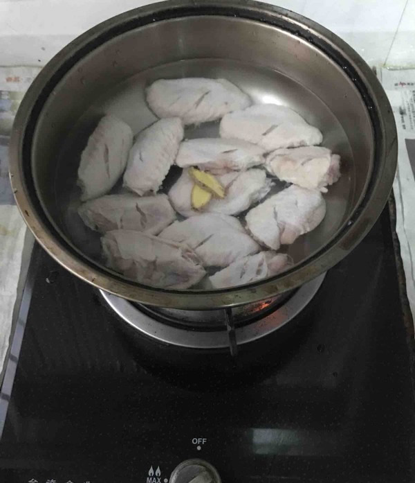 3准备一些水,凉水放入鸡翅,水要没过鸡翅,放3片姜片。