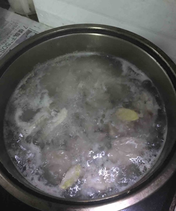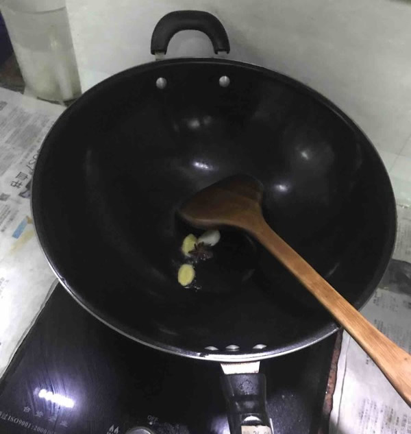 6放一勺油等油热了,在放入2片姜片,一个蒜头,一个八角。