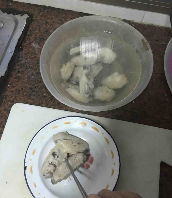 5另准备一盆冷水,把煮熟的鸡翅放到凉水里,过一下脏东西。然后把鸡翅从冷水中,夹起放入干净的盘子。