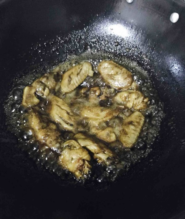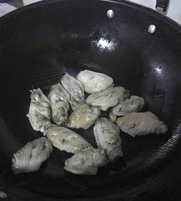 7等有香味了,放入鸡翅(最好一个一个夹进去,不然水很多,会溅到油)煎至两面金黄。