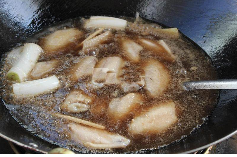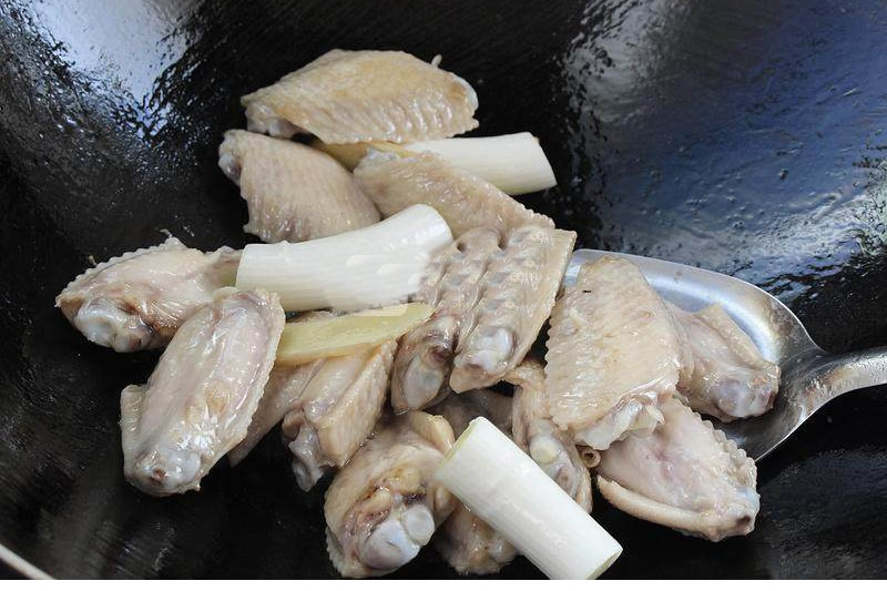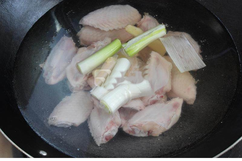 2鸡翅加葱段、姜片和料酒焯水,用温水洗净,控干水分备用;