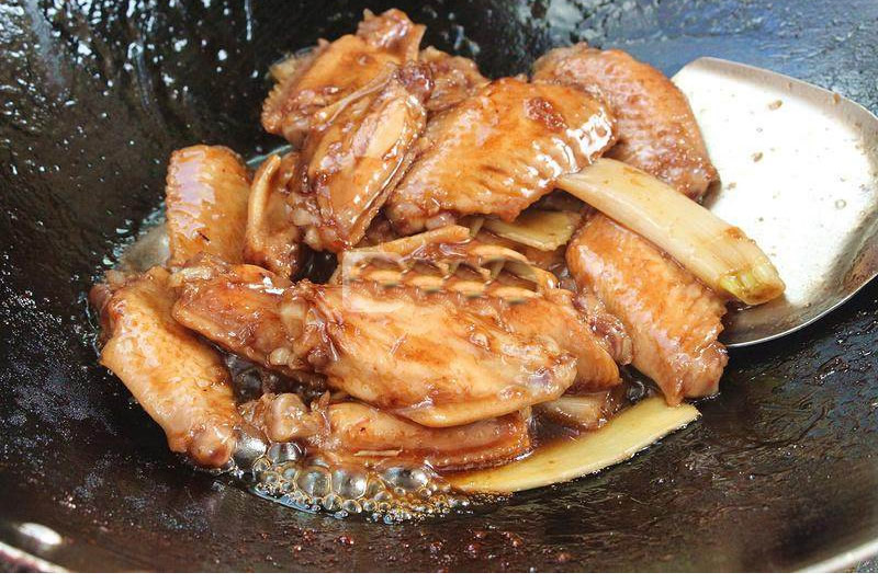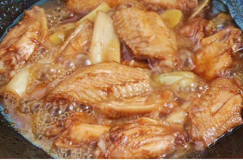 7汤汁浓稠后出锅,再将锅底的汤汁浇在鸡翅上;