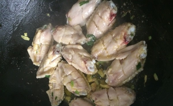 3锅里加油预热后小火,把鸡翅一个个平铺在锅上,慢慢煎,一面变色后在煎另外一面
