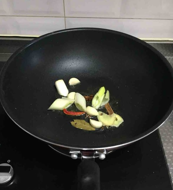 1锅中倒入适量油,烧热后放入炒料爆香