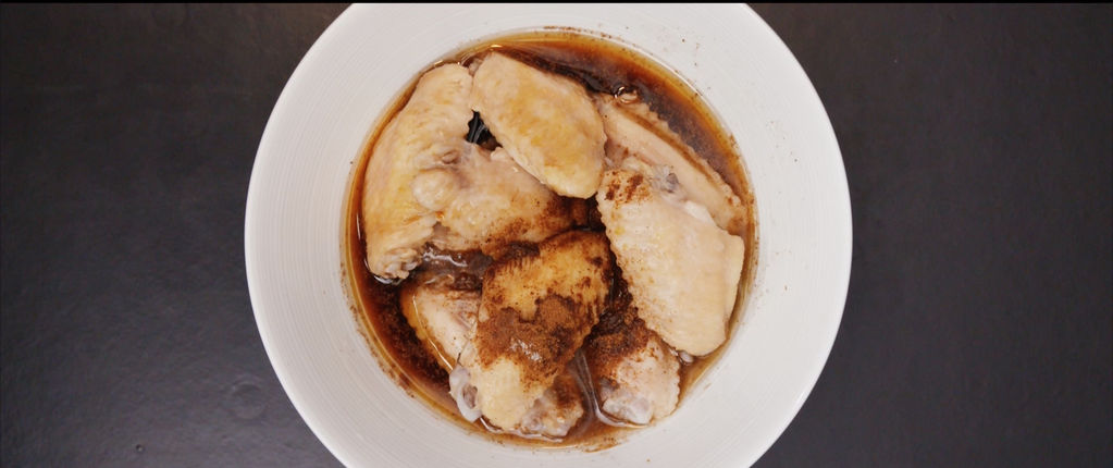 3鸡翅焯水后,倒入柠檬汁、五香粉、盐、料酒和生抽,腌制鸡翅2小时;