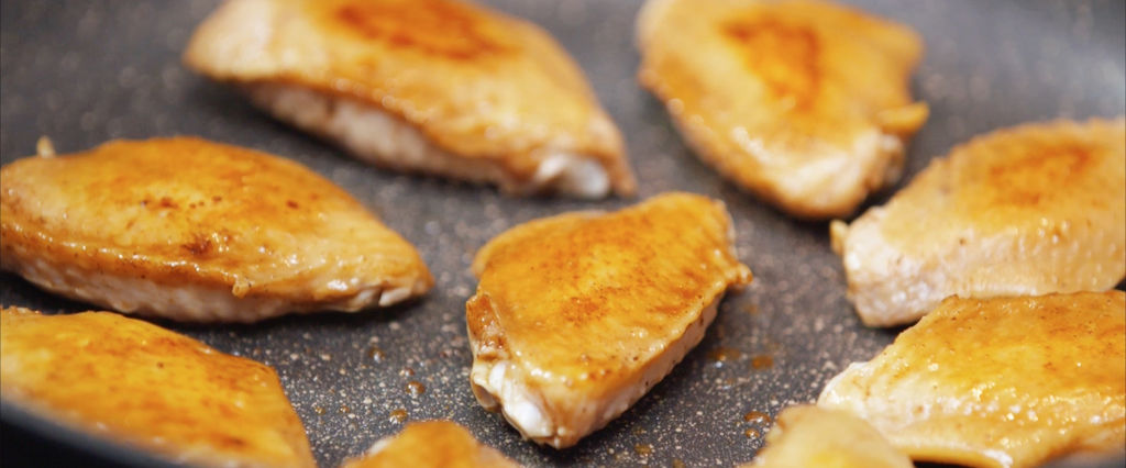 4鸡翅放入锅中,两面煎至金黄。另起一油锅,炒香葱、蒜末,倒入鸡翅翻炒,倒一些生抽;
