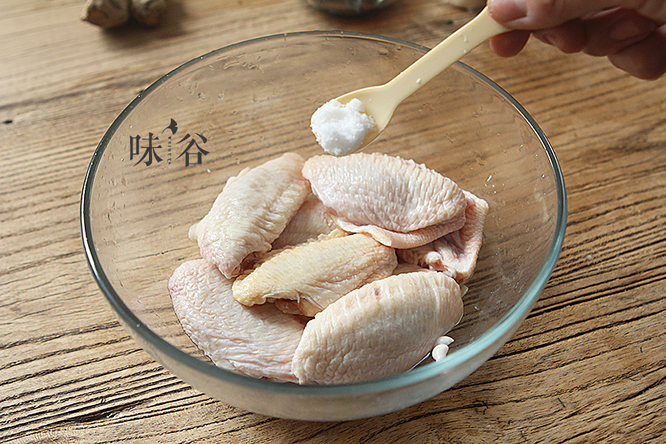 2鸡翅洗去血水,加一小勺盐腌制20分钟 。
