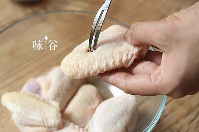 3用叉子或者牙签在鸡翅表面戳一些小孔。
