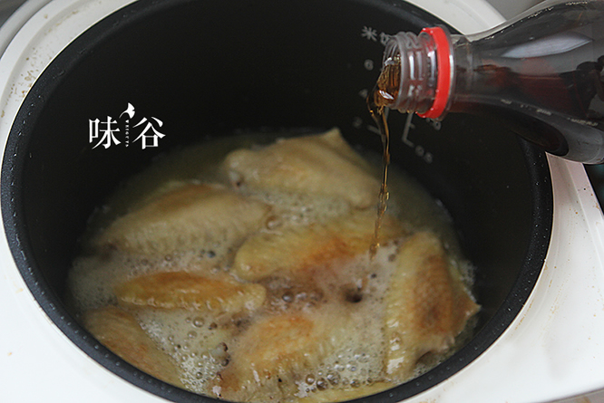5待鸡翅表面煎至金黄色,倒入可乐,没过鸡翅再倒入生抽就行,盖盖,跳键后再按一次煮饭键,收汁即可。(可乐和酱油的比例约为3:1)