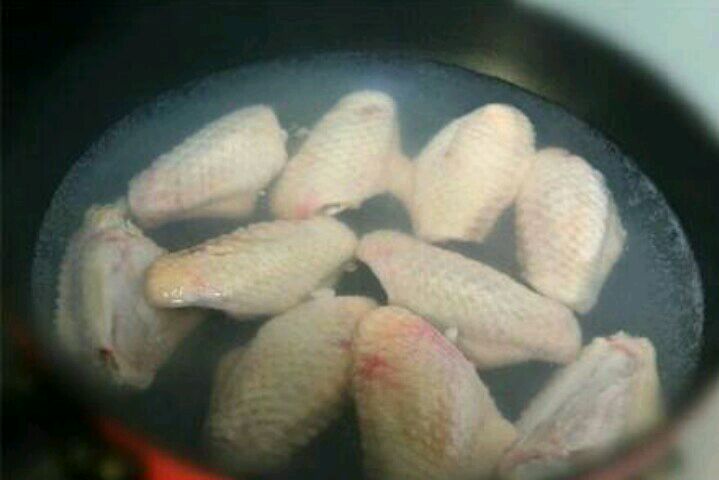 3把鸡翅放入开水中烫一下,捞出浮沫