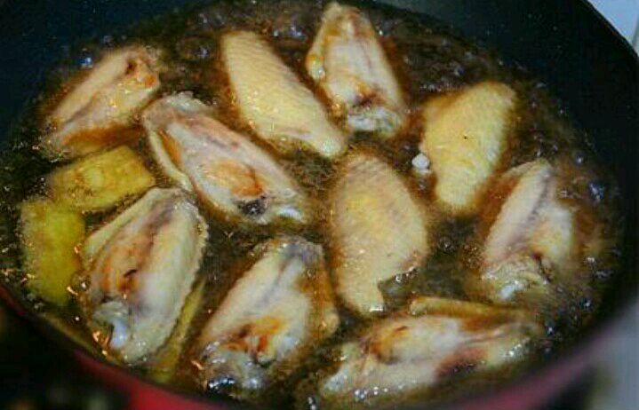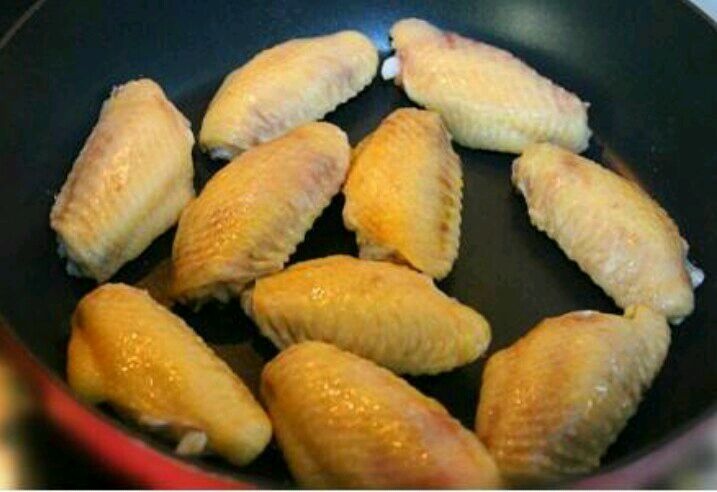 4锅中少放一点油,然后将鸡翅放入锅中,小火煎至金黄色