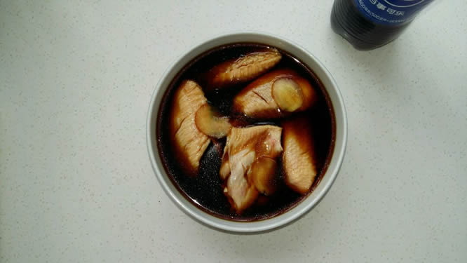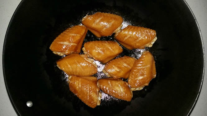 6煎好的鸡翅放入之前腌制用的碗里,泡一会。这是一个热胀冷缩的过程,鸡皮会更嫩滑爽口。趁这个时间把锅洗干净,锅里实在是很油啊~~