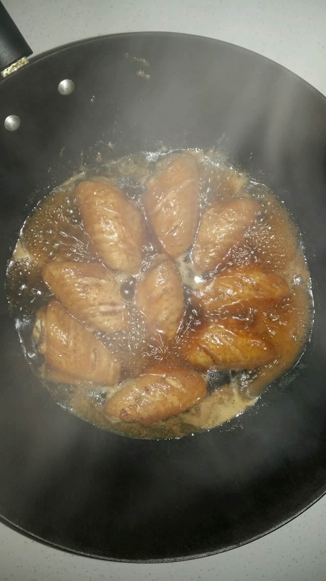 7重新架上锅点火,把半熟的鸡翅和酱油+可乐倒入,中火煮到沸腾,看这烟雾缭绕的,就让鸡翅在里面咕噜咕噜翻滚几分钟。把面上的浮沫撇去,大火收汁。