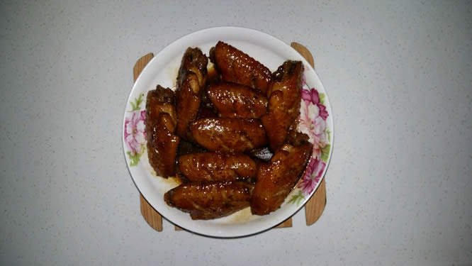 8最后装盘,把收浓稠的汁淋在鸡翅上。大功告成,开吃!