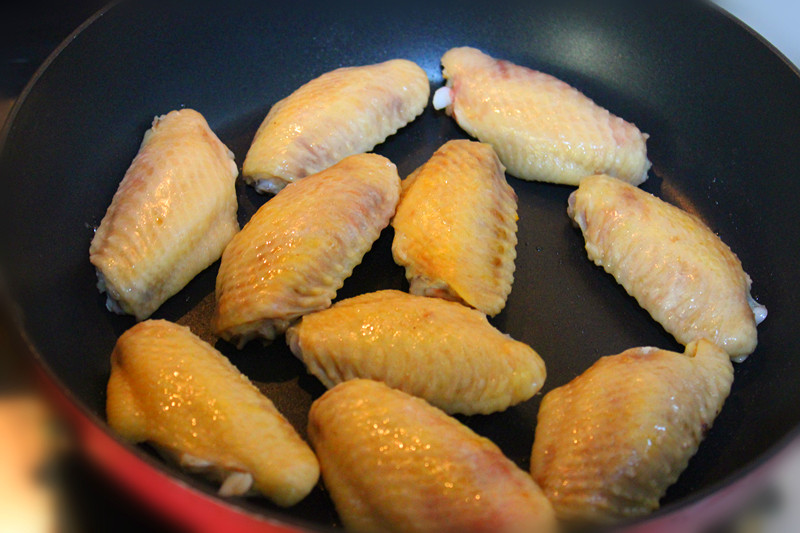 3锅中少放一点点油,然后将鸡翅放锅中,小火煎至表面金黄