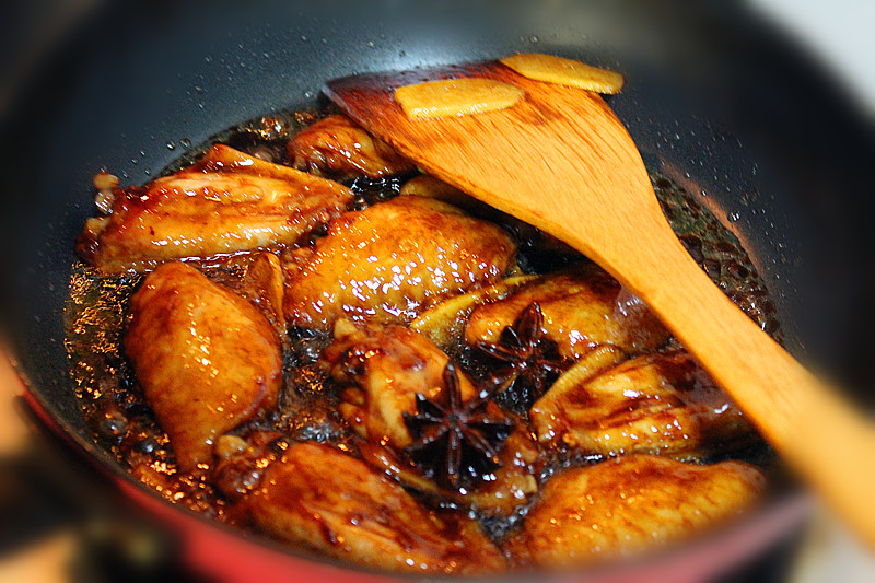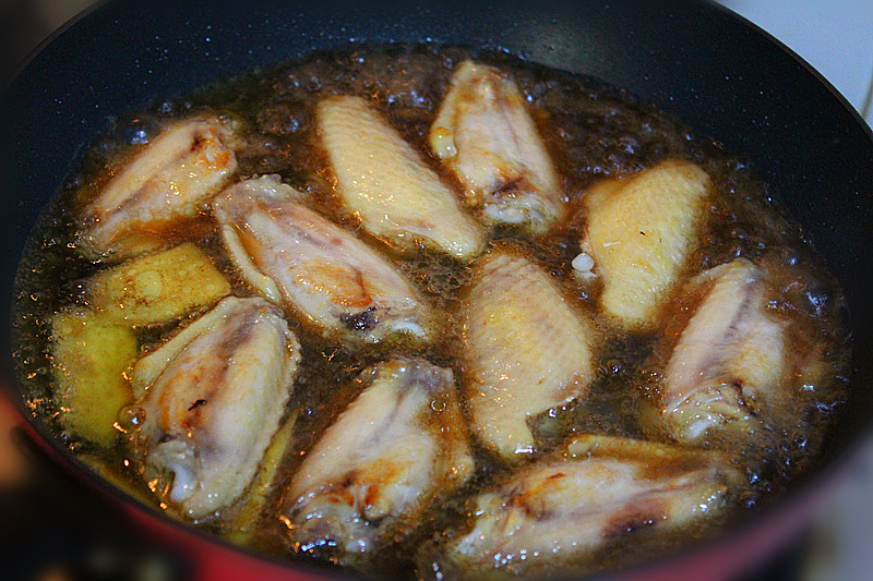 5转大火收汁。收汁的时候要不停的用铲子翻动,直至鸡翅表面裹上焦糖色,锅中有明油渗出即可。