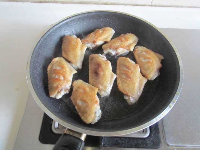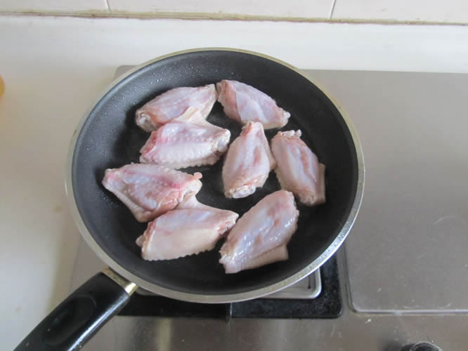 2. 放比平时少些的油煎鸡翅,鸡翅正面先朝下放入, 将两面煎至金黄:
