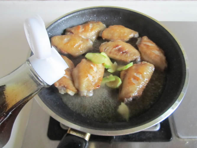 3烧热锅,放少许油, 将腌好的鸡翅正面朝下放入锅中;