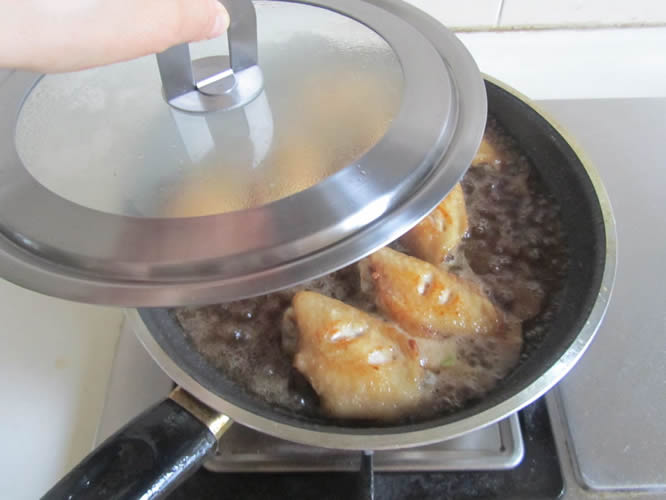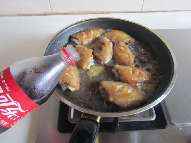3. 焖煮时加入没过鸡翅底部的可乐加盖炖煮十分钟,再加入盐调味,大火收汁即可。