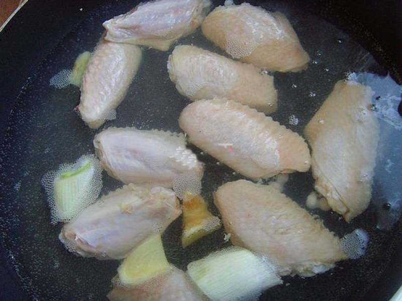 2鸡翅洗净,入葱姜水中煮沸捞出,沥干水份。