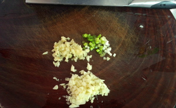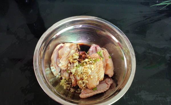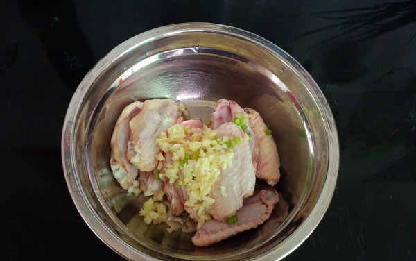4将鸡翅中放盘内,再加入姜、蒜和小葱