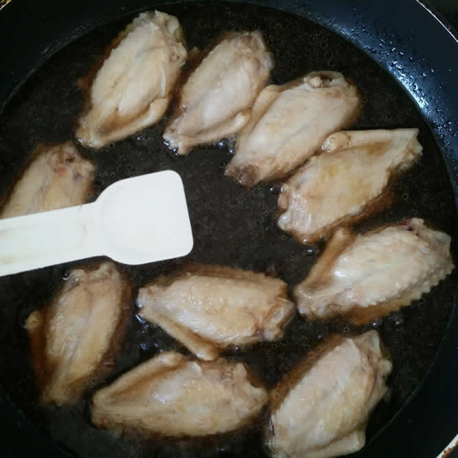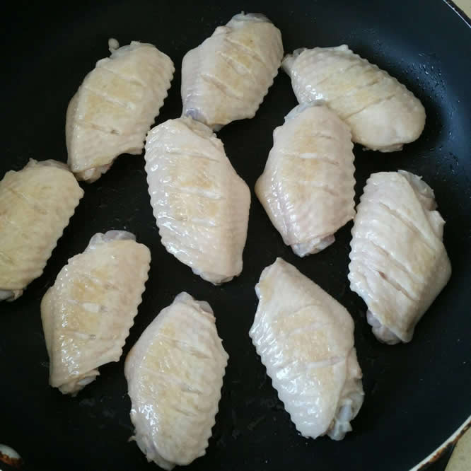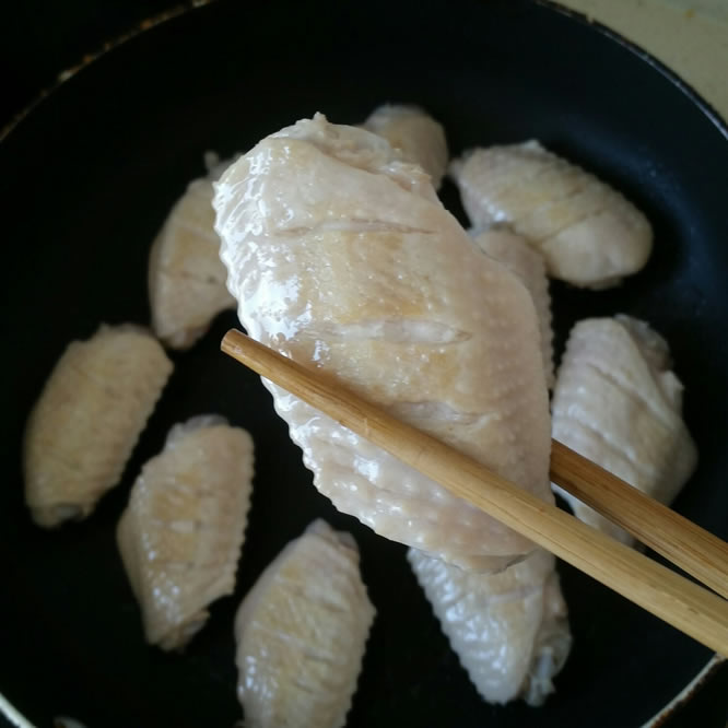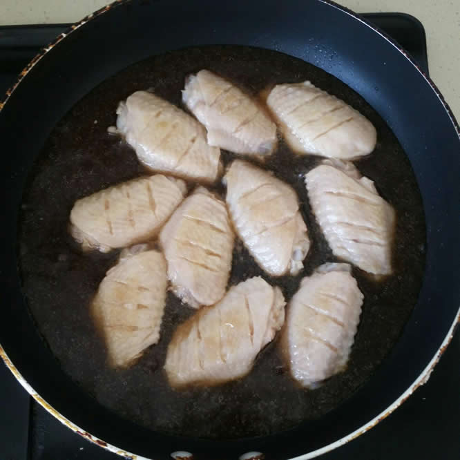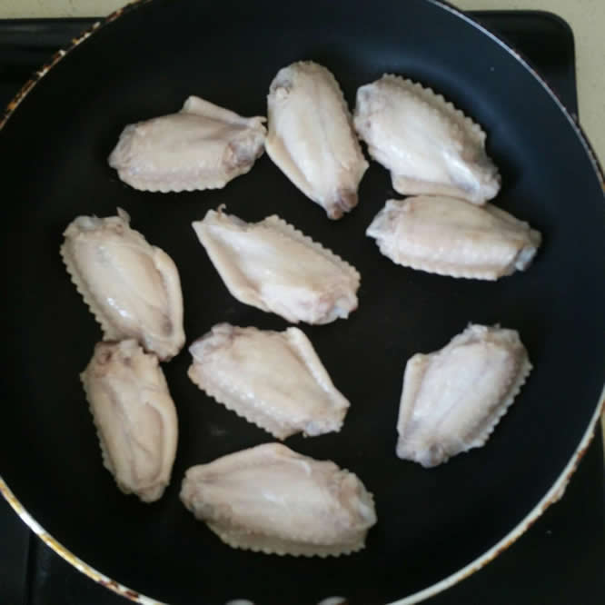 5平底锅开小火,放入鸡翅。