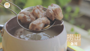3倒入15ml料酒,大火焯水,去除血水。(厨娘Tips:一定要记得焯水哦,这样排骨才不会腥)
