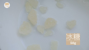 7锅内倒入10ml食用油,放入50g冰糖。(厨娘Tips:排骨红润有光泽的秘方就在于炒糖色,小火慢慢熬就不会失败啦!焦糖和肉还能产生能让排骨更香哦!)