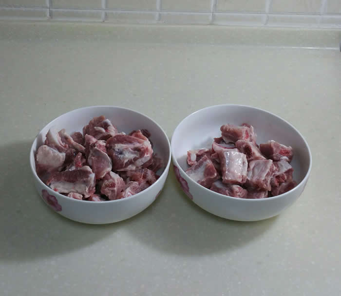 1请店主把排骨斩成小段,冲洗干净, (排骨两头不规则的用来炖藕,留 下中间排骨净重是500克)