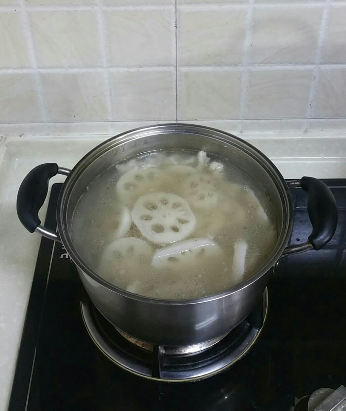 4排骨两头部分留锅中,加入莲藕炖 40分钟左右,放少许盐,鸡粉即可